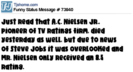 X has just read that A.C. Nielsen Jr., pioneer of TV ratings firm, died yesterday as well, but due to news of Steve Jobs it was overlooked and Mr. Nielsen only received an 8.5 rating.