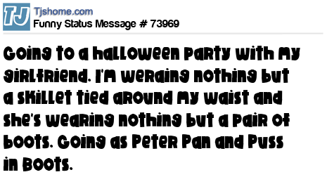 X is going to a halloween party with my girlfriend. I'm weraing nothing but a skillet tied around my waist and she's wearing nothing but a pair of boots. Going as Peter Pan and Puss in Boots.