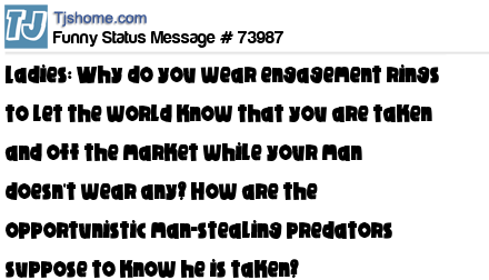 - # 73892 My girl wants to change the engagement rules. She tells me, 'Babe, why do I got to wear a ring and let guys know I'm taken, and you don't got to wear nothing?' I told her, 'Babe, I wear my sad face every day.'