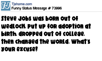 - # 101498 Steve Jobs was born out of wedlock, put up for adoption at birth, fired from the company in 1985, dropped out of college, then changed the world. What's your excuse?
