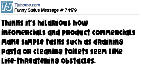 X thinks it's hilarious how infomercials and product commercials make simple tasks such as draining pasta or cleaning toilets seem like life-threatening obstacles.
