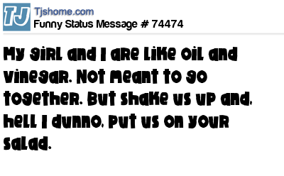 X  My girl and I are like oil and vinegar. Not meant to go together. But shake us up and, hell I dunno, put us on your salad.