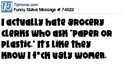 X I actually hate grocery clerks who ask "paper or plastic." It's like they know I f*ck ugly women.