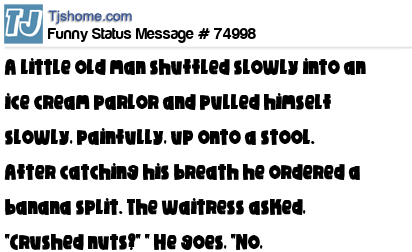 - # 208141 An old man shuffled slowly into the ice cream parlor and pulled himself painfully up onto a stool. After catching his breath, he ordered a banana split. The waitress goes, "crushed nuts?" "No, no, no" he said. "Arthritis."