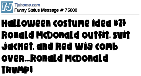 X Halloween costume idea #27 Ronald McDonald outfit, suit jacket, and Red Wig comb over…Ronald McDonald Trump!