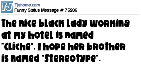 X The nice black lady working at my hotel is named "Cliche". I hope her brother is named "Stereotype".