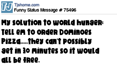X says My solution to world hunger: Tell em to order Dominoes Pizza.....they can't possibly get in 30 minutes so it would all be free.