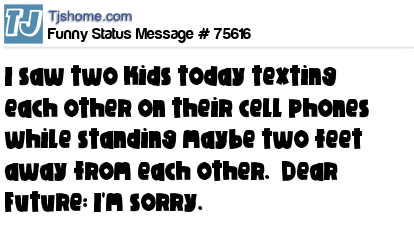 X I saw two kids today texting each other on their cell phones while standing maybe two feet away from each other. Dear Future: I'm sorry.