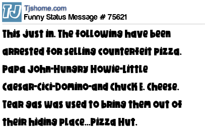 X This just in. The following have been arrested for selling counterfeit pizza. Papa John-Hungry Howie-Little Caesar-Cici-Domino-and Chuck E. Cheese. Tear gas was used to bring them out of their hiding place...Pizza Hut.