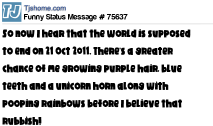 X So now I hear that the world is supposed to end on 21 Oct 2011. There's a greater chance of me growing purple hair, blue teeth and a unicorn horn along with pooping rainbows before I believe that rubbish!