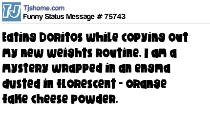 X Eating Doritos while copying out my new weights routine. I am a mystery wrapped in an engma dusted in florescent - orange fake cheese powder.