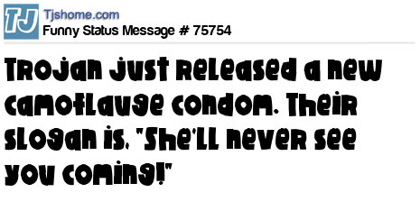 X Trojan just released a new camoflauge condom. Their slogan is, "She'll never see you coming!"