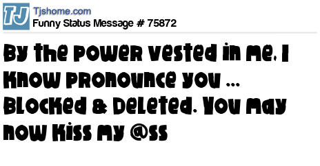 X says by the power vested in me, I know pronounce you ... Blocked & Deleted. You may now kiss my @ss