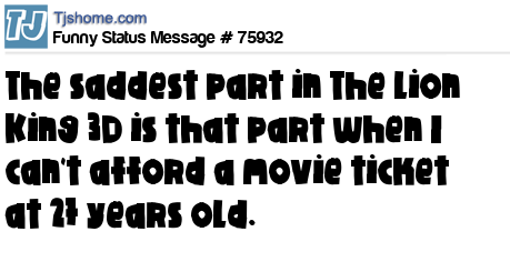 X is The saddest part in The Lion King 3D is that part when I can't afford a movie ticket at 27 years old.