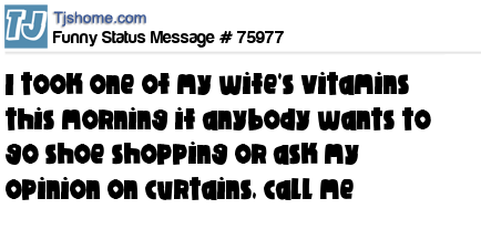 - # 75870 I took one of my wife's vitamins this morning if anybody wants to go shoe shopping or ask my opinion on curtains, call me