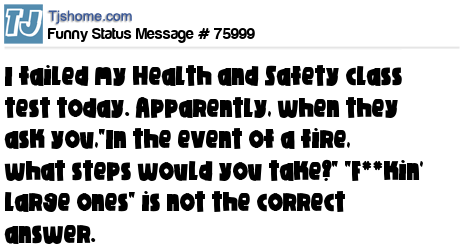 X I failed my Health and Safety class test today. Apparently, when they ask you,"In the event of a fire, what steps would you take?" "F**kin' large ones" is not the correct answer.