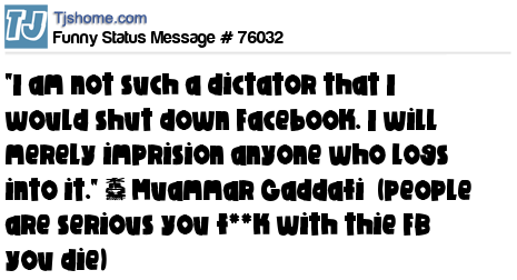 X says "I am not such a dictator that I would shut down Facebook. I will merely imprision anyone who logs into it." ~ Muammar Gaddafi (people are serious you f**k with thie FB you die)