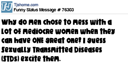 X says Why do men chose to mess with a lot of mediocre women when they can have ONE great one? I guess Sexually Transmitted Diseases (STDs) excite them.