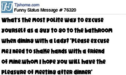 X what's the most polite way to excuse yourself as a guy to go to the bathroom when dining with a lady? "Please excuse me,I need to shake hands with a friend of mine,whom I hope you will have the pleasure of meeting after dinner"