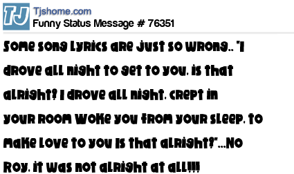 X says some song lyrics are just so wrong.. "I drove all night to get to you, is that alright? I drove all night, crept in your room Woke you from your sleep, to make love to you Is that alright?"...No Roy, it was not alright at all!!!