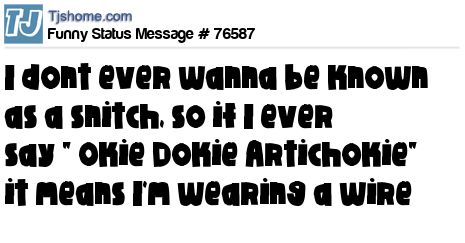 - # 51457 Just so all of my friends know, If I ever say the phrase "okie dokie artichokie" to you, it's a signal and means I've either been kidnapped or I'm wearing a wire. One of the two