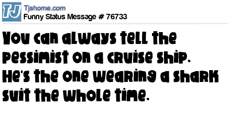 X  You can always tell the pessimist on a cruise ship. He's the one wearing a shark suit the whole time.