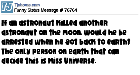X says If an astronaut killed another astronaut on the moon, would he be arrested when he got back to earth? The only person on earth that can decide this is Miss Universe.