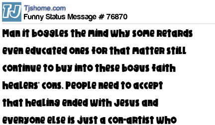 X says Man it boggles the mind why some retards even educated ones for that matter still continue to buy into these bogus faith healers' cons. People need to accept that healing ended with Jesus and everyone else is just a con-artist who should be arrested.