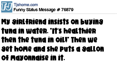 X My girlfriend insists on buying tuna in water. "It's healthier then the tuna in oil!" Then we get home and she puts a gallon of mayonnaise in it.