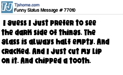 - # 17228 I guess I just prefer to see the dark side of things. The glass is always half empty. And cracked. And I just cut my lip on it. And chipped a tooth
