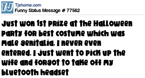 X has just won 1st prize at the Halloween party for best costume which was male genitalia. I never even entered. I just went to pick up the wife and forgot to take off my bluetooth headset