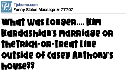 - # 77786 What was longer.... Kim Kardashian's marriage or theTrick-or-Treat line outside of Casey Anthony's house?