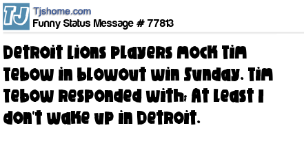 X says Detroit Lions players mock Tim Tebow in blowout win Sunday. Tim Tebow responded with; At least I don't wake up in Detroit.