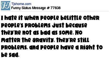 X I hate it when people belittle other people's problems just because they're not as bad as some. No matter the gravity, they're still problems, and people have a right to be sad.