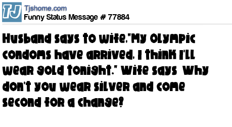 - # 87082 Husband:"My Olympic condoms are here, I think I'll wear the gold one 2night" Wife:"Couldnt you wear the silver one and come 2ND 4 a change"