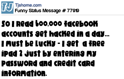 X So I read 600,000 facebook accounts get hacked in a day... I must be lucky - I get a free ipad 2 just by entering my password and credit card information.