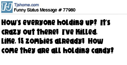 X  How's everyone holding up?  It's crazy out there!  I've killed, like, 15 zombies already!  How come they are all holding candy?