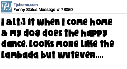 X is I <3 it when I come home & my dog does the happy dance, looks more like the lambada but wutever....
