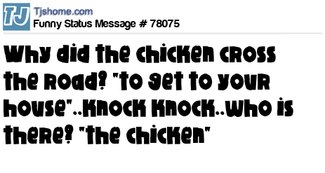 X why did the chicken cross the road? "to get to your house"..knock knock..who is there? "the chicken"