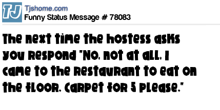 - # 78086 The next time the hostess asks you "Would you like a table?", you should respond "No, not at all, I came to the restaurant to eat on the floor. Carpet for 5 please."