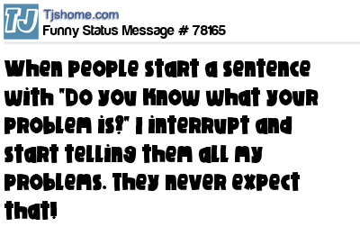 - # 24934 When people start a sentence with "Do you know what your problem is..." I interrupt and start telling them all my problems. They never expect that.