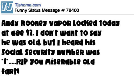 X Andy Rooney vapor locked today at age 92. I don't want to say he was old, but I heard his Social Security number was "1".....RIP you miserable old fart!