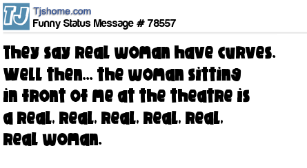 X is They say real woman have curves. Well then... the woman sitting in front of me at the theatre is a real, real, real, real, real, real woman.