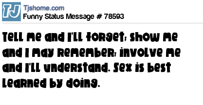 X says Tell me and I'll forget; show me and I may remember; involve me and I'll understand. Sex is best learned by doing.