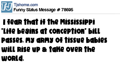X I fear that if the Mississippi "life begins at conception" bill passes, my army of tissue babies will rise up & take over the world.