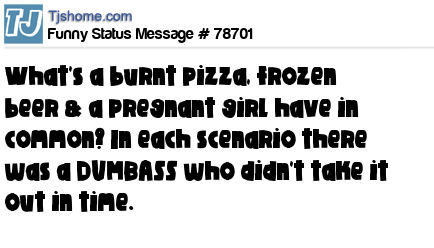 - # 77164 What does frozen beer, burnt pizza and a pregnant girl all have in common? A dumba$$ who forgot to take it out in time.