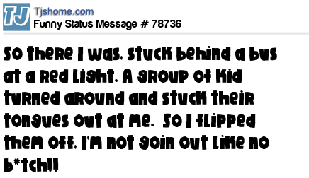 X  so there I was, stuck behind a bus at a red light. A group of kid turned around and stuck their tongues out at me.  So I flipped them off, I'm not goin out like no b*tch!!