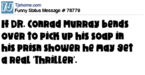 - # 81416 apparently Conrad Murray wasn't a SMOOTH CRIMINAL like he though. now if he drops the soap he gets a THRILLER.