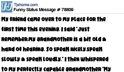 X My friend came over to my place for the first time this evening, I said "Just remember,my grandmother is a bit old & hard of hearing. So speak nicely,speak slowly & speak loudly." I then whispered to my perfectly capable grandmother "My friend is slightly