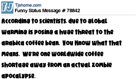 X says According to scientists, due to global warming is posing a huge threat to the arabica coffee bean. You know what that means. We're one worldwide coffee shortage away from an actual zombie apocalypse.